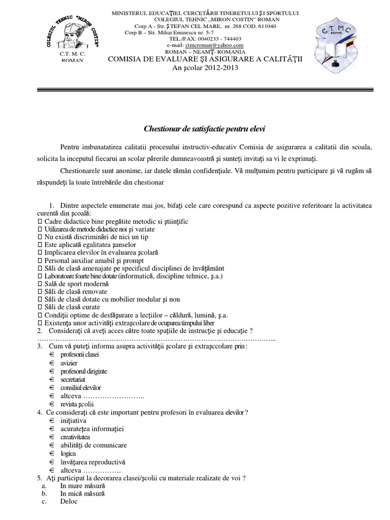 Chestionarele pentru părinţi, elevi şi profesori prin care.